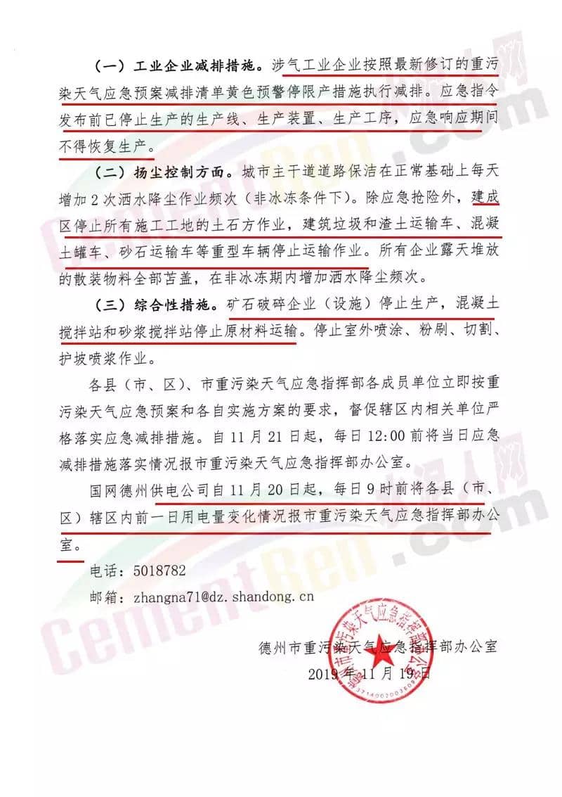 德州市重污染天氣應(yīng)急指按部發(fā)布通知文件稱,根據(jù)省重污染天氣應(yīng)急工作小組辦公室通知建議,德州市重污染天氣應(yīng)急指揮部決定 11月20日0時(shí)發(fā)布重污染天氣黃色預(yù)警,11月21日0時(shí)啟動III級應(yīng)急響應(yīng)。應(yīng)急呼應(yīng)措施包括:工業(yè)企業(yè)減排措施,涉氣工業(yè)企業(yè)按照最新修訂的重污染天氣應(yīng)急預(yù)案 減排清單黃色預(yù)警停限產(chǎn)措施執(zhí)行減排 。應(yīng)急指令發(fā)布前已停止生產(chǎn)的生產(chǎn)線、生產(chǎn)裝置、生產(chǎn)工序,應(yīng)急響應(yīng)期間不得恢復(fù)生產(chǎn)。揚(yáng)塵控制方面,建成區(qū)停止所有施工工地的土石方作業(yè),建筑垃圾和渣土運(yùn)輸 車、混凝土罐車、砂石運(yùn)輸車等重型車輛停止運(yùn)輸作業(yè)。礦石破碎企業(yè)(設(shè)施)停止生產(chǎn),混凝土攪拌站和砂漿攪拌站停止原材料運(yùn)輸 。國網(wǎng)供電公司自11月20日起,每日9時(shí)前將各縣 (市、區(qū))轄區(qū)內(nèi)前一日用電量變化情況報(bào)重污染天氣應(yīng)急指揮部辦公室。通知原文如下: