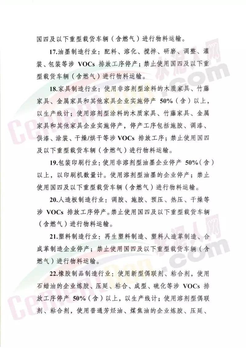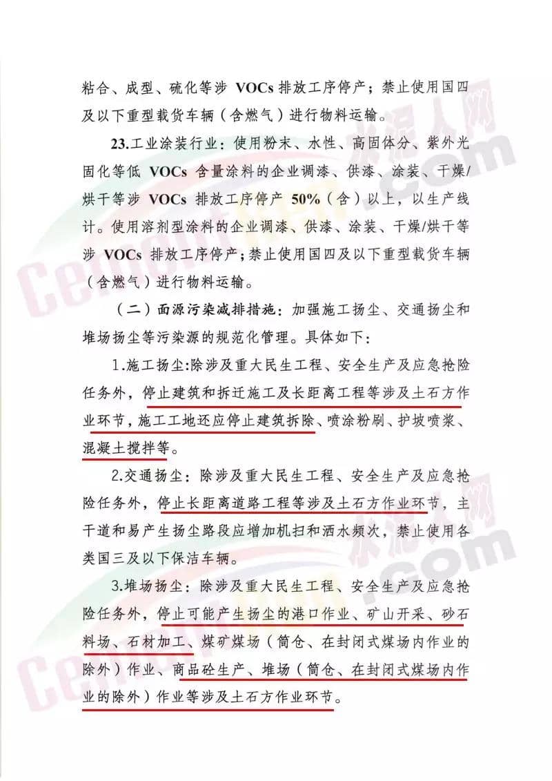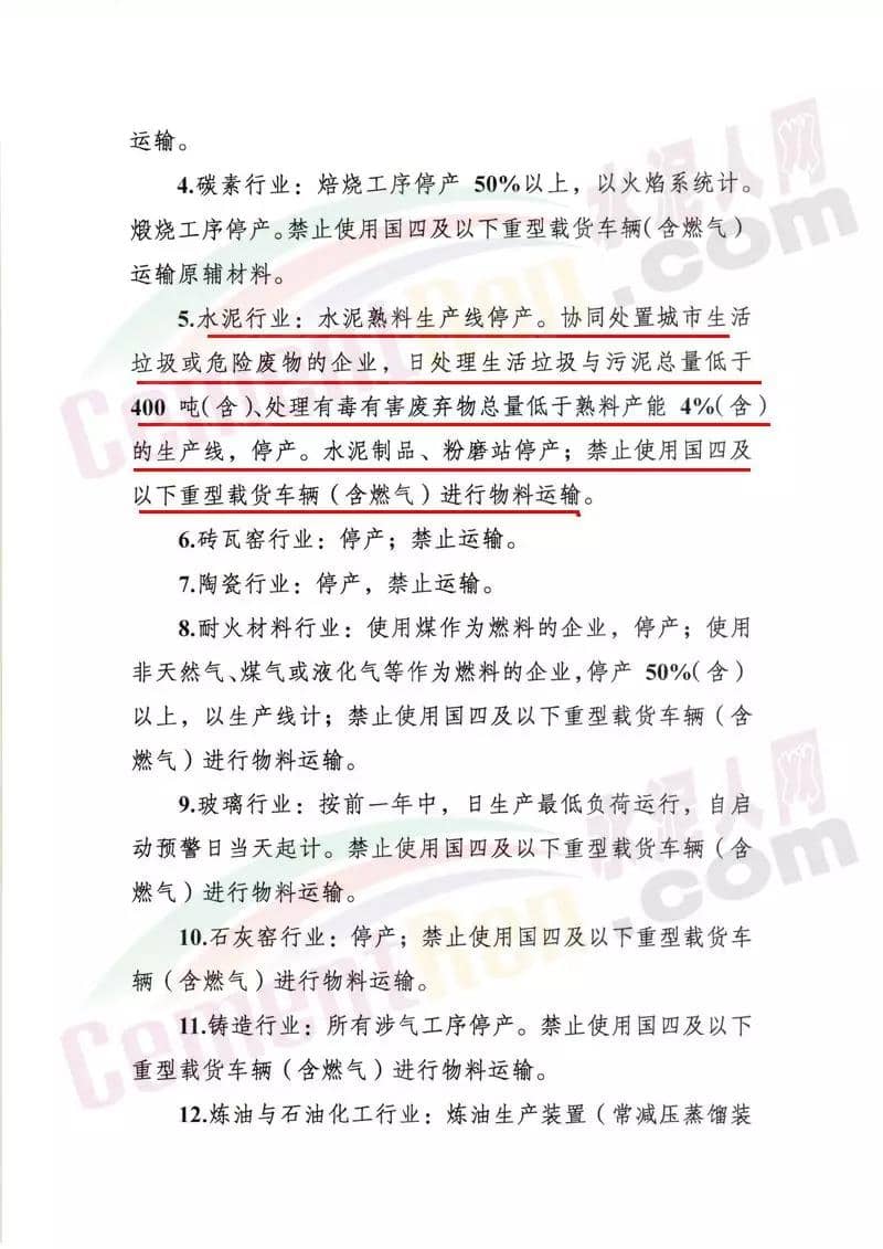 水泥行業(yè),水泥熟料生產(chǎn)線停產(chǎn)。協(xié)同處置城市生活垃圾或危險(xiǎn)廢物的企業(yè),日處理生活垃圾與污染總量低于400噸(含)、處理有毒有害廢棄物總量低于熟料產(chǎn)能4%(含)的生產(chǎn)線,停產(chǎn)。水泥制品、粉磨站停產(chǎn);禁止使用國四及以下重型載貨車輛(含燃?xì)?進(jìn)行物料運(yùn)輸。