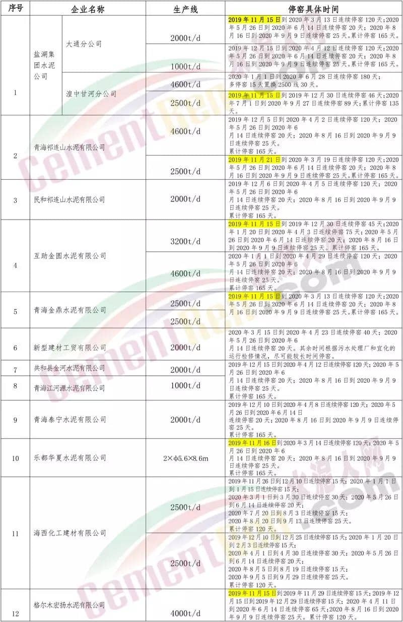 青海省水泥企業(yè)錯(cuò)峰停窯計(jì)劃(2019-2020年)