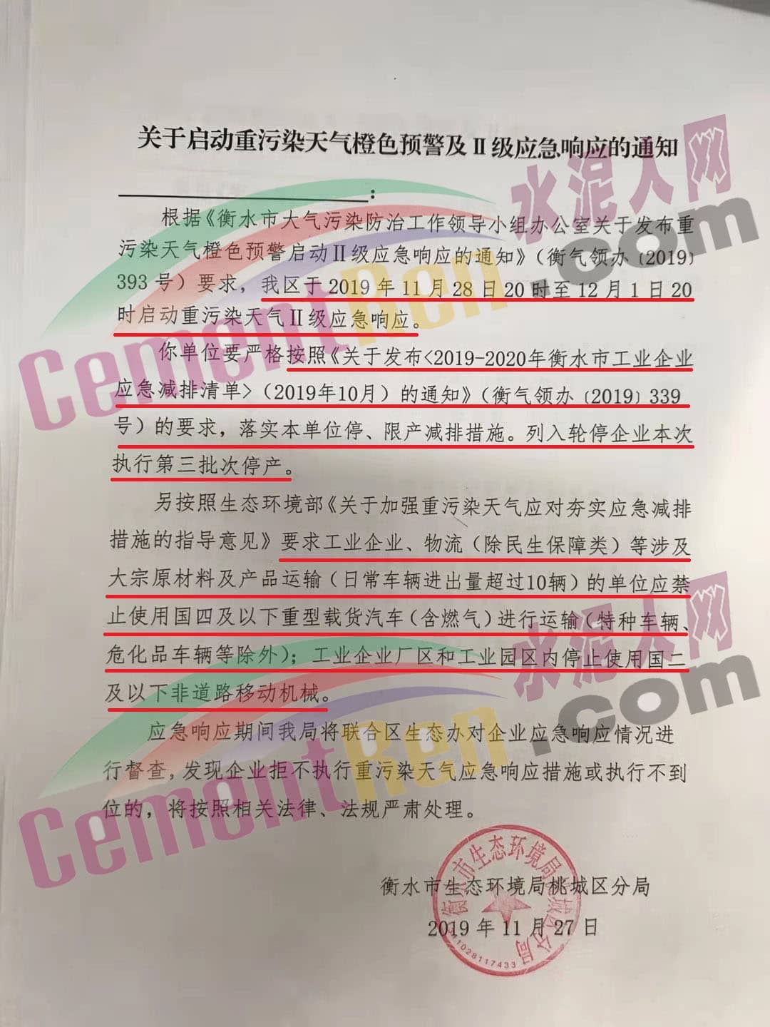 強(qiáng)制性污染減排措施要求工業(yè)企業(yè)嚴(yán)格執(zhí)行《關(guān)于發(fā)布〈2019-2020年衡水市工業(yè)企業(yè)應(yīng)急減排清單〉(2019年10月)的通知》(衡氣領(lǐng)辦〔2019〕339號(hào))的清單中橙色預(yù)警減排措施。施工工地、工業(yè)企業(yè)廠區(qū)和工業(yè)園區(qū)內(nèi)禁止使用國(guó)二及以下的非道路移動(dòng)機(jī)械(除清潔能源和緊急檢修作業(yè))、不達(dá)標(biāo)的非道路移動(dòng)機(jī)械,建筑垃圾和渣土運(yùn)輸車、砂石運(yùn)輸車輛禁止上路行駛。按照生態(tài)環(huán)境部《關(guān)于加強(qiáng)重污染天氣應(yīng)對(duì)夯實(shí)應(yīng)急減排措施的指導(dǎo)意見(jiàn)》要求工業(yè)企業(yè)、物流(除民生保障類)等涉及大宗原材料及產(chǎn)品運(yùn)輸(日常車輛進(jìn)出量超過(guò)10輛)的單位應(yīng)禁止使用國(guó)四及以下重型載貨汽車(含燃?xì)?進(jìn)行運(yùn)輸(特種車輛、?;奋囕v等除外)。