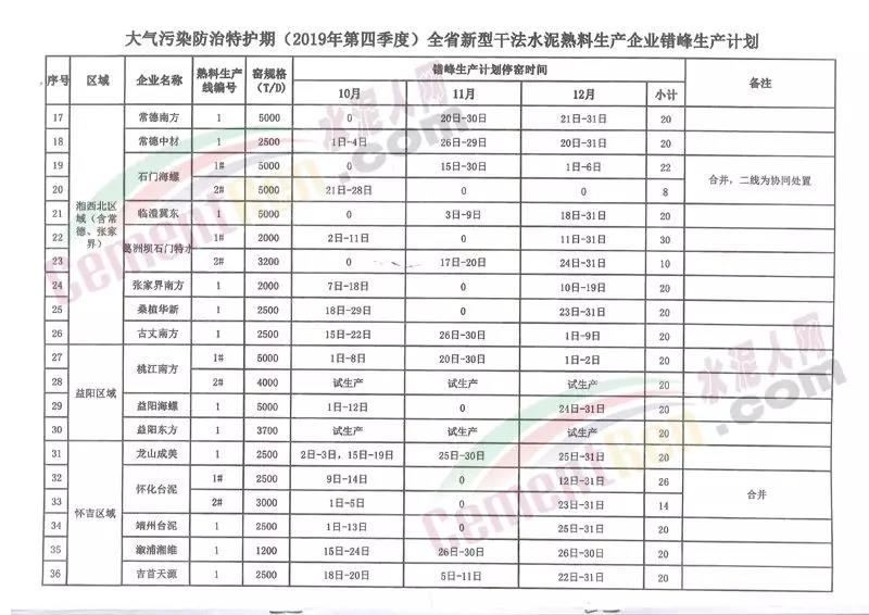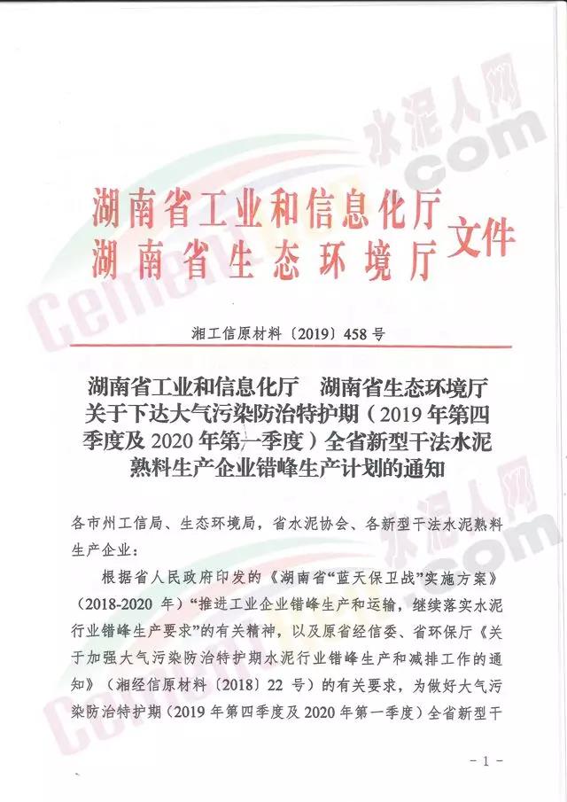 四季度日前,湖南省工信廳聯(lián)合生態(tài)環(huán)境廳發(fā)布《關(guān)于下達大氣污染防治特護期(2019年第四季度及2010年第一季度)全省新型干法水泥熟料生產(chǎn)企業(yè)錯峰生產(chǎn)計劃的通知》稱,根據(jù)湖南省政府印發(fā)的《湖南省“藍天保衛(wèi)戰(zhàn)”實施方案》(2018-2020年)“推進工業(yè)企業(yè)錯峰生產(chǎn)和運輸,繼續(xù)落實水泥行業(yè)錯峰生產(chǎn)要求”的有關(guān)精神以及原省經(jīng)信委、省環(huán)保廳《關(guān)于加強大氣污染防治特護期水泥行業(yè)錯峰生產(chǎn)和減排工作的通知》有關(guān)要求,為做好大氣污染防治特護期全省新型干法水泥熟料生產(chǎn)企業(yè)錯峰生產(chǎn)工作。其中2019年四季度按照協(xié)會編制的計劃執(zhí)行。2020年一季度各新型干法水泥熟料生產(chǎn)企業(yè)按照錯峰停窯不少于40天。重點區(qū)域長株潭及岳陽、常德 、益陽和衡陽市的企業(yè)不少于45天執(zhí)行。承擔垃圾協(xié)同處置任務(wù)的熟料生產(chǎn)線減半執(zhí)行。通知原文如下: