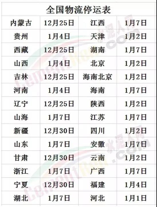 黑龍江處于冬季較寒冬地區(qū),每到冬季水泥企業(yè)發(fā)運(yùn)部門都會(huì)調(diào)整發(fā)運(yùn)時(shí)間,上年曾經(jīng)有過隔日發(fā)運(yùn)或夜間停發(fā)的通知。而每到年底物流行業(yè)都會(huì)通知調(diào)整發(fā)運(yùn)時(shí)間和停運(yùn)時(shí)間,今年也不例外。相比2019年,2020年的春節(jié)提早了11天。伴隨春節(jié)的提前,物流也將提前停運(yùn)。據(jù)往年慣例,一般物流提前15-20天停運(yùn)放假,這也意味著明年1月份僅一周左右的時(shí)間正常發(fā)貨,接下來的12月份將成為經(jīng)銷商備貨的高峰期。2020年的春節(jié),受消費(fèi)壓抑、品牌價(jià)格戰(zhàn)等因素影響,還將迎來一波搶購熱潮。對于經(jīng)銷商而言,今年的備貨黃金周期在12月份。距離春節(jié)備貨不足20天,趁著還有時(shí)間,加緊備貨。近日,物流部門發(fā)布了河北、山東、江蘇、湖北、湖南、上海、安徽、內(nèi)蒙古等27個(gè)省份地區(qū)春節(jié)期間物流停運(yùn)通知。全國物流停運(yùn)通知,從12月25日起就陸續(xù)停運(yùn)了。時(shí)至年底,隨著天氣寒冷和最近霧霾天氣嚴(yán)重,物流部發(fā)出聲明,全國物流停運(yùn)時(shí)間已經(jīng)確定:內(nèi)蒙古、西藏、吉林、遼寧等地12月25日停運(yùn);新疆、甘肅、寧夏等地12月30日停運(yùn);河北1月1日停運(yùn);天津、北京、陜西、四川、云南等地1月2日停運(yùn);福建、貴州、山西、河南等地1月4日停運(yùn);上海、山東、浙江、湖北、江西、湖南、海南、江蘇、安徽、廣西等地1月7日停運(yùn)。