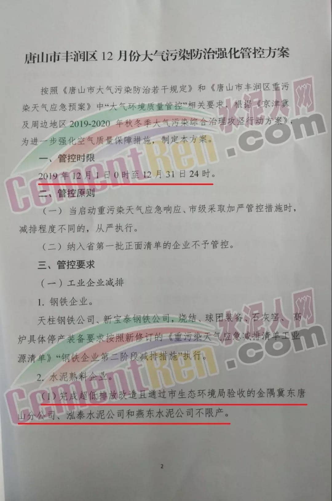 (1) 完成超低排放改造且通過(guò)市生態(tài)環(huán)境局驗(yàn)收的金隅冀東唐山分公司、金隅冀東灤州公司,啟新水泥、三友水泥,泓泰泥和燕東水泥不限產(chǎn)。
