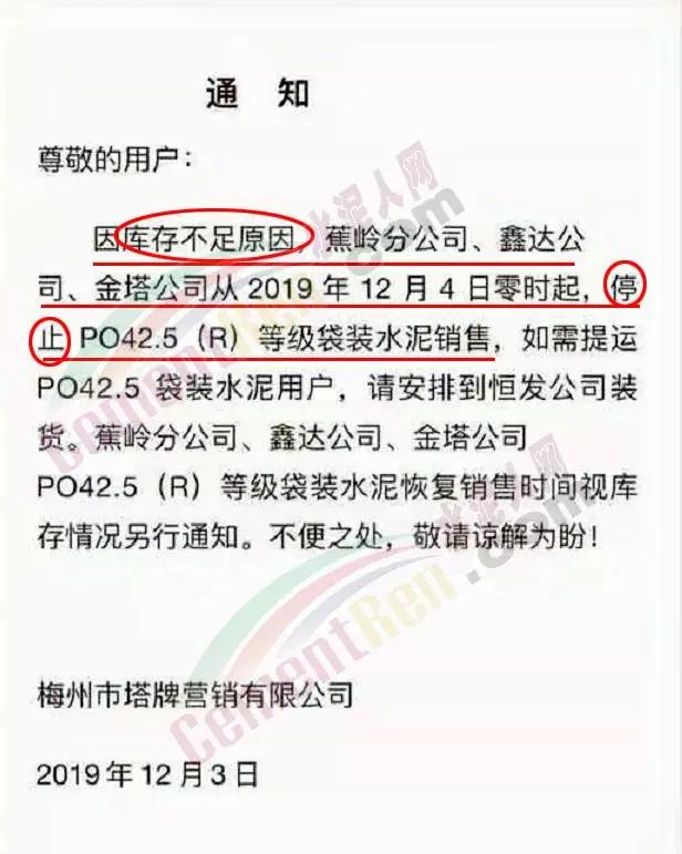昨日(12月3日),梅州市塔牌營銷有限公司發(fā)布通知稱,因庫存不足原因,焦嶺分公司、鑫達公司、金塔公司從今日(12月4日)零時起停止PO42.5(R)等級袋裝水泥銷售,如需提運PO42.5(R)袋裝水泥用戶,請安排到恒發(fā)公司裝貨。焦嶺分公司、鑫達公司、金塔公司PO42.5(R)袋裝水泥恢復(fù)銷售時間視庫存情況另行通知。