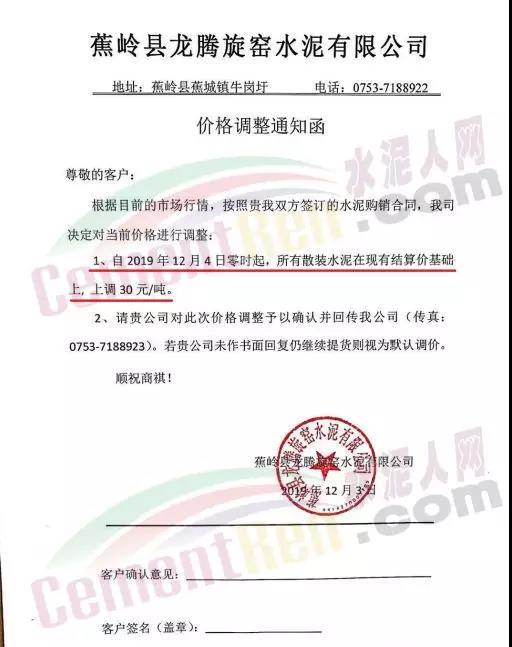 蕉嶺縣龍騰炫窯水泥有限公司發(fā)布了價格調(diào)整通知函稱,根據(jù)目前的市場行情,決定對價格進行調(diào)整,自2019年12月4日零時起,所有散裝水泥在現(xiàn)有的結(jié)算價基礎(chǔ)上上調(diào)30元/噸。