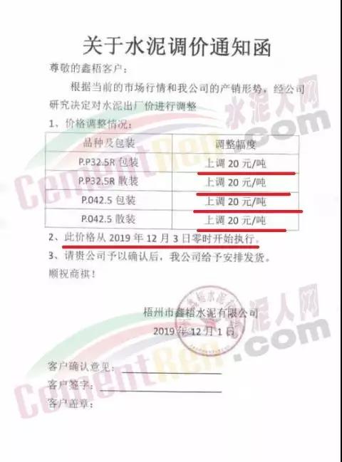 根據(jù)當(dāng)前市場形勢及產(chǎn)銷存實際情況,經(jīng)公司研究決定,定于2019年12月3日00:00起對袋裝、散裝各品種水泥價格上調(diào)20元/噸。