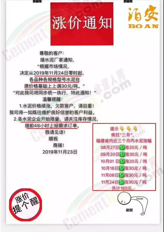 11月23日,福建泊安水泥的漲價通知稱,根據(jù)市情況從11月24日零時起,各品種各規(guī)格水泥在原價格基礎(chǔ)上上調(diào)30元/噸。自此,福建省內(nèi)近三個月內(nèi)水水泥水泥連漲六波,累計漲價達(dá)160元/噸。