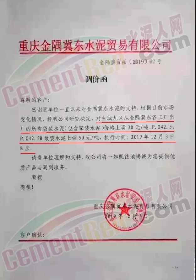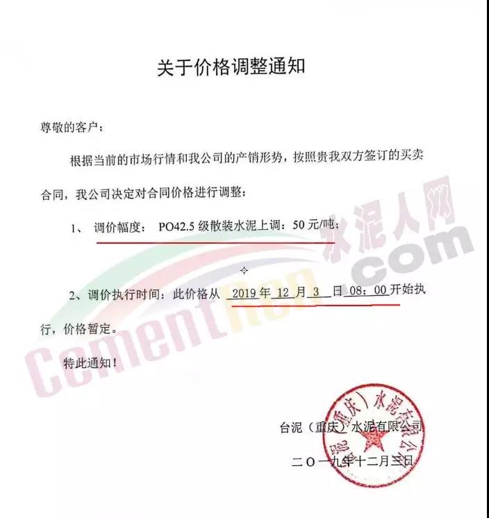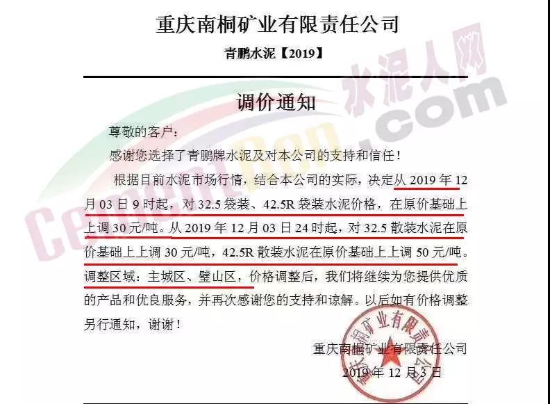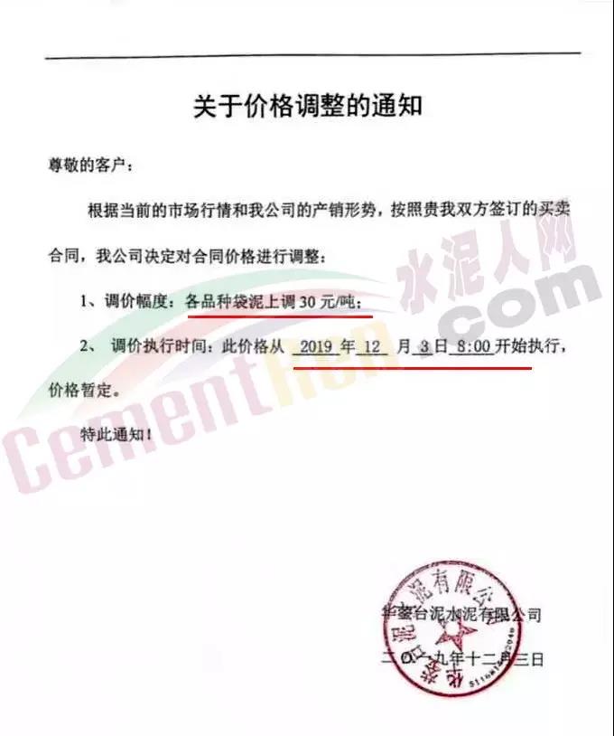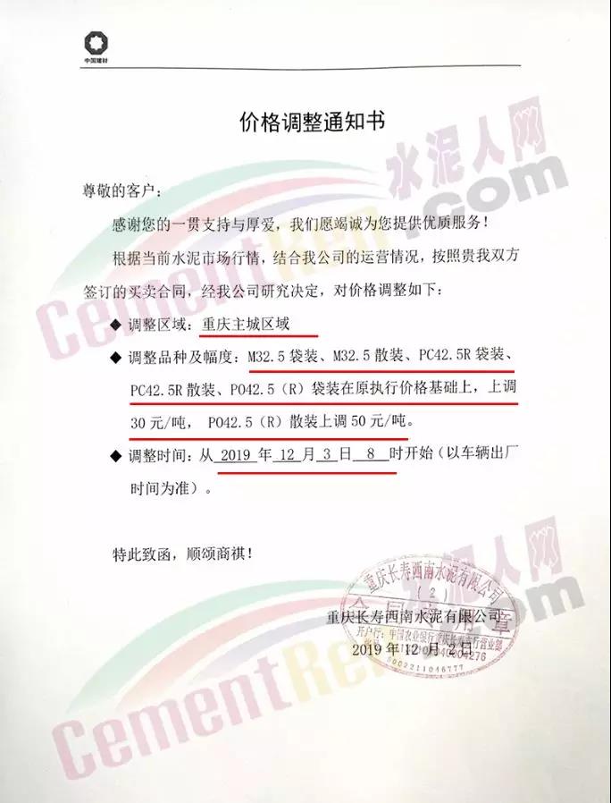 近期,因市場原因,經(jīng)研究決定,自2019年12月5日零時起,發(fā)往貴公司區(qū)域的各品種散、袋水泥在原有價格基礎(chǔ)上上調(diào)30元/噸;