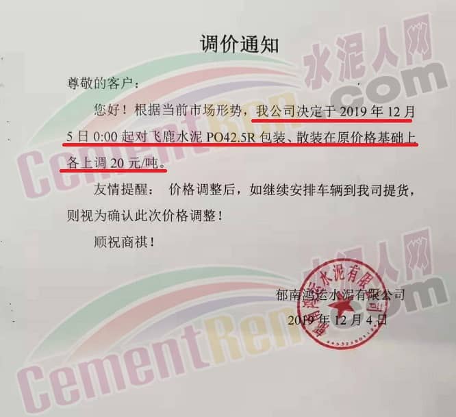 郁南鴻運(yùn)水泥有限公司通知自12月5日0時(shí)起對(duì)飛鹿水泥PO42.5R包裝、散裝在原價(jià)格基礎(chǔ)各上調(diào)20元/噸。
