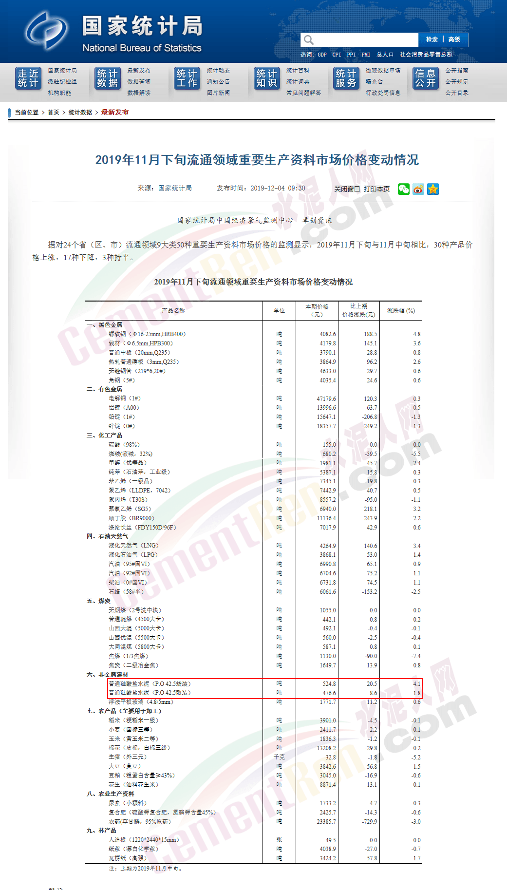 國(guó)家統(tǒng)計(jì)局近期對(duì)24個(gè)省(區(qū)、市)流通領(lǐng)域9大類(lèi)50種重要生產(chǎn)資料市場(chǎng)價(jià)格的監(jiān)測(cè)數(shù)據(jù)顯示,2019年11月下旬與11月中旬相比,30種產(chǎn)品價(jià)格上漲,17種下降,3種持平。其中非金屬建材普通硅酸鹽水泥(P.O 42.5袋裝)均價(jià)524.8元/噸,較上期上漲20.5元/噸,漲幅4.1%;普通硅酸鹽水泥(P.O 42.5散裝)均價(jià)476.6元/噸,較上期上漲8.6元/噸,漲幅1.8%。這個(gè)價(jià)格已超過(guò)2018年的最高點(diǎn),創(chuàng)2011年以來(lái)的最高價(jià)。