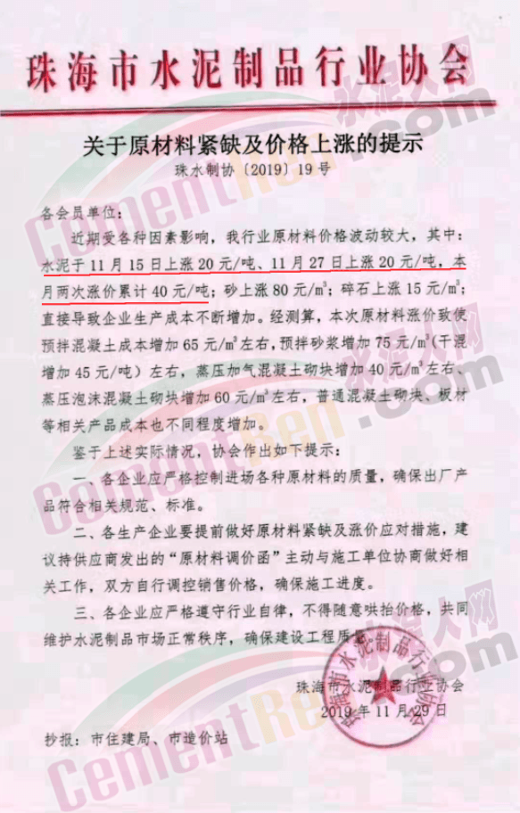 10月以來(lái),廣東水泥經(jīng)歷了六輪連漲,漲幅達(dá)100元/噸以上。珠海市水泥制品行業(yè)協(xié)會(huì)此前發(fā)布《關(guān)于原材料緊缺及價(jià)格上漲的提示》稱(chēng),水泥價(jià)格于11月15日上漲20元/噸、11月27日上漲20元/噸,一個(gè)月內(nèi)累計(jì)上漲40元/噸。