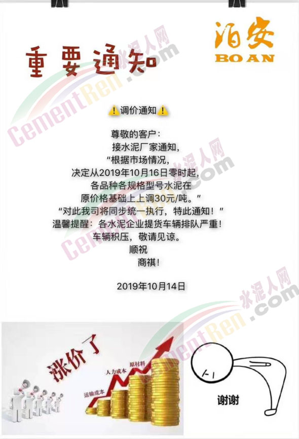 水泥企業(yè)漲價(jià)通知