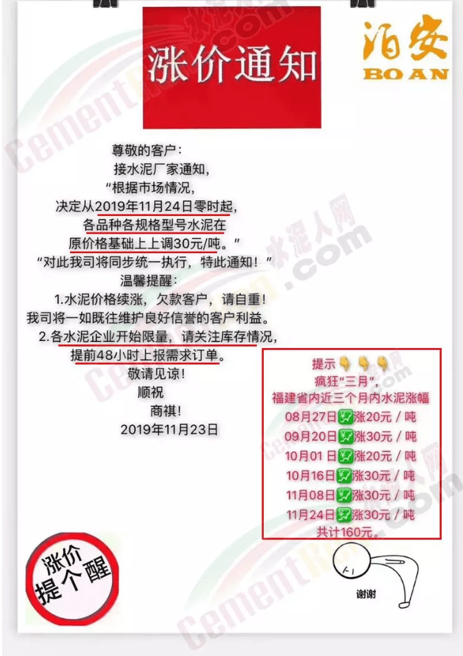 泊安水泥8月下旬至11月24日7連漲,累計(jì)漲價(jià)達(dá)到190元/噸。據(jù)了解更有甚者八月下旬至今8輪連漲,累計(jì)漲價(jià)達(dá)210元/噸。