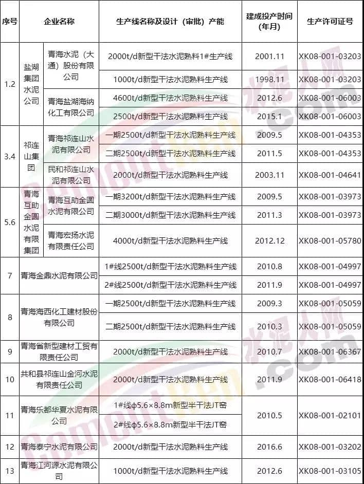 青海省水泥熟料生產(chǎn)線(xiàn)清單(截止2018年12月31日)