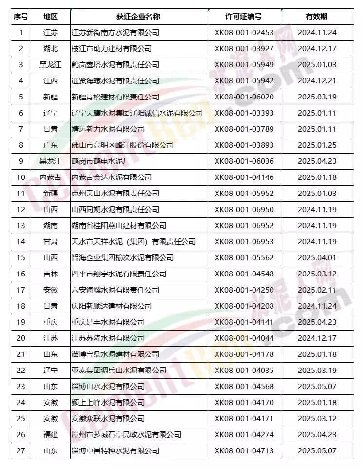 上個月到期延續(xù)共27個編號,其中包括海螺水泥、南方水泥、亞泰集團、山水水泥、上峰水泥旗下水泥企業(yè)。