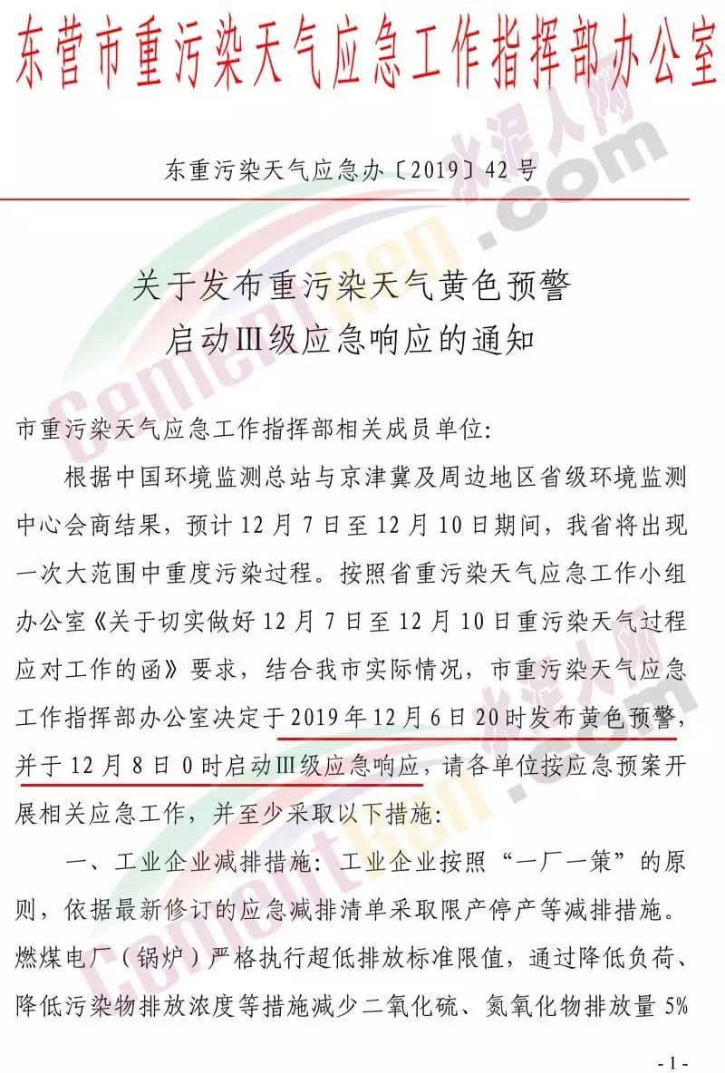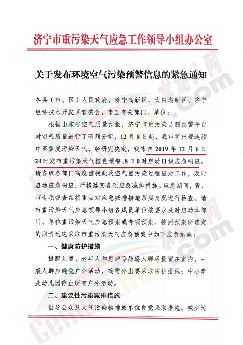其中,濟(jì)寧市《關(guān)于發(fā)布環(huán)境空氣污染預(yù)警信息的緊急通知》稱,自12月6日24時(shí)發(fā)布重污染天氣橙色預(yù)警,8日0時(shí)啟動(dòng)II級應(yīng)急響應(yīng)。