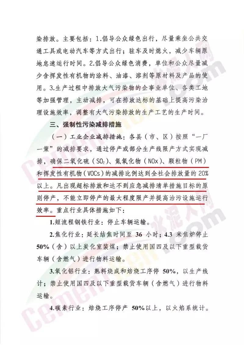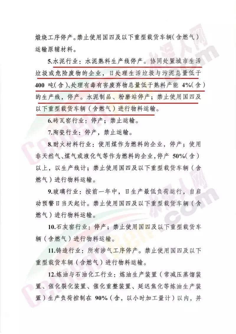強(qiáng)制性污染減排措施要求水泥行業(yè)水泥熟料生產(chǎn)線停產(chǎn)。協(xié)同處置城市生活垃圾或危廢的企業(yè),日處理生活垃圾與污泥總量低于400噸(含 )、處置有毒有害廢棄物總量低于熟料產(chǎn)能4%(含)的生產(chǎn)線停產(chǎn)。水泥制品、粉磨站停產(chǎn);禁止使用國四及以下重型載貨車輛(含燃?xì)?進(jìn)行物料運(yùn)輸。