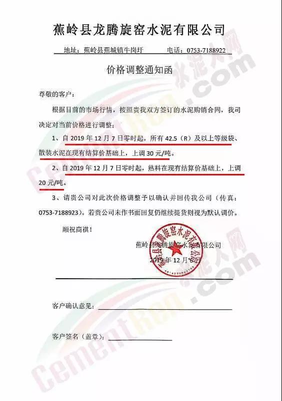 蕉嶺縣龍騰旋窯水泥有限公司價格調(diào)整通知函稱,根據(jù)目前的市場行情,對當前價格進行調(diào)整,自12月7日零時起,所有42.5(R)及以上等級袋、散裝水泥在現(xiàn)有結算價格基礎上上調(diào)30元/噸。熟料在現(xiàn)有結算價格基礎上上調(diào)20元/噸。