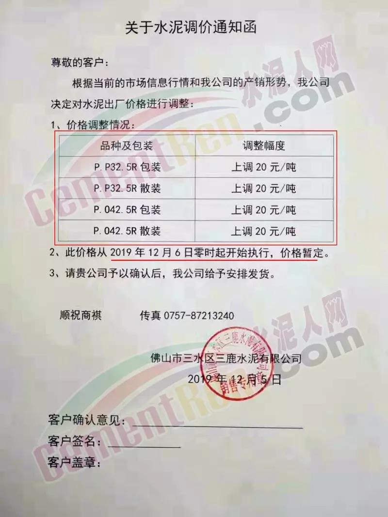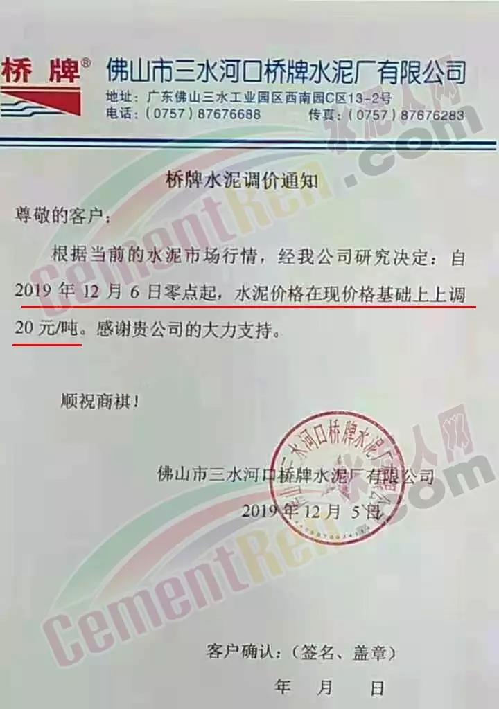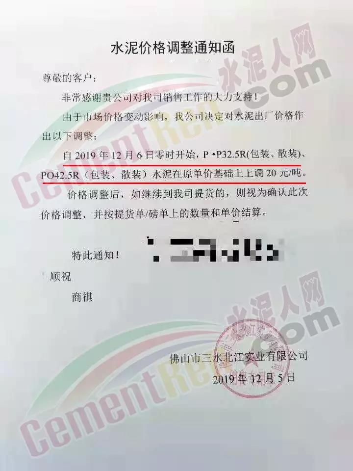 廣東佛山市多家水泥企業(yè)通知自12月有6日起上調(diào)水泥價格,各標號水泥上調(diào)20元/噸。