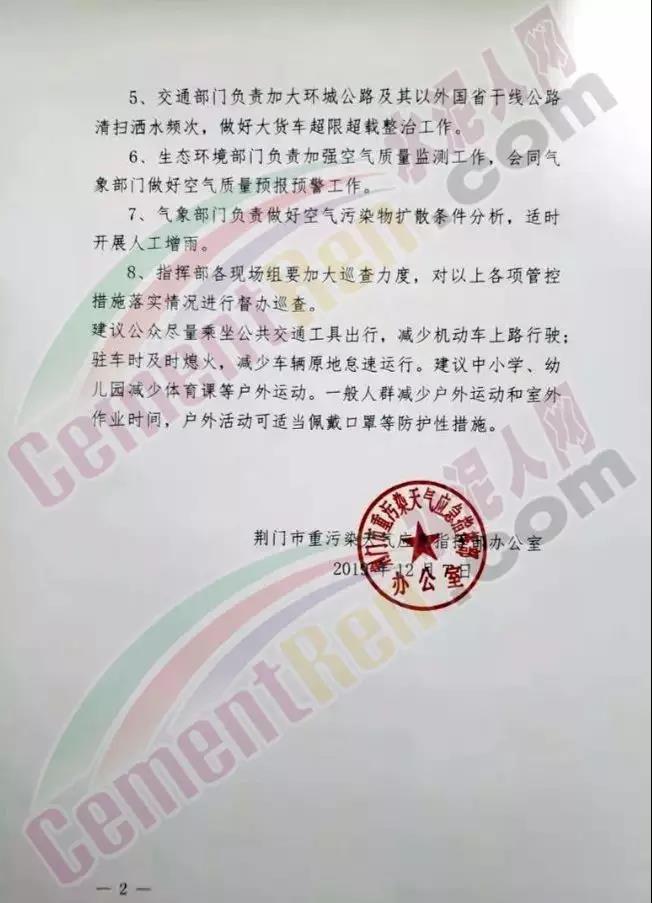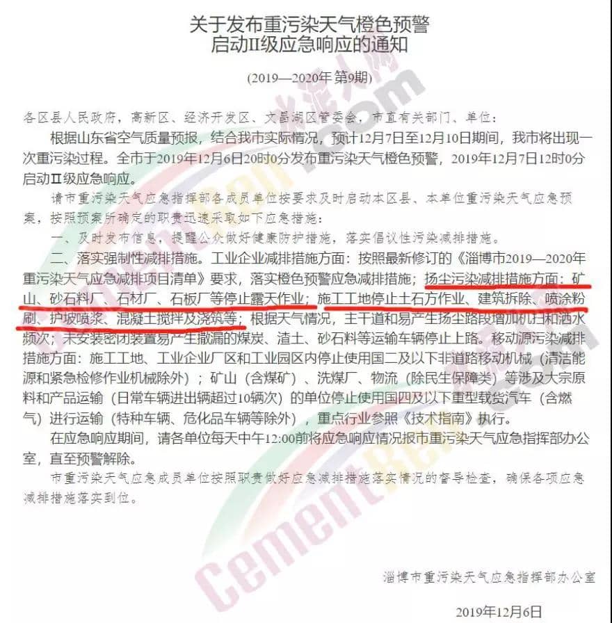 淄博市發(fā)布《重污染天氣橙色預(yù)警,啟動Ⅱ級應(yīng)急響應(yīng)的通知》,礦山、砂石料廠、石材廠、石板廠等停止露天作業(yè);施工工地停止土石方作業(yè)、建筑拆除、噴涂粉刷、護坡噴漿、混凝土攪拌及澆筑等;