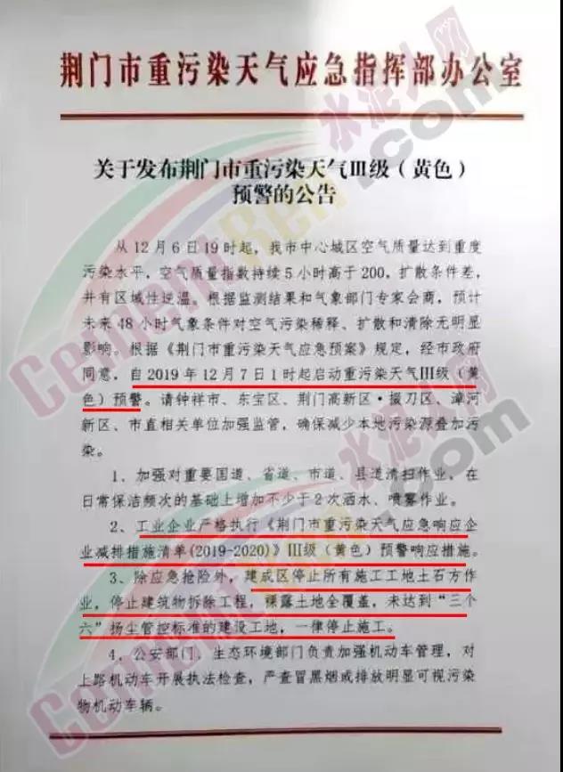 湖北荊門市重污染天應(yīng)急指揮部辦公室發(fā)布《荊門市重污染天氣III級(黃色)預(yù)警的公告》稱,自12月6日19時起,荊門市中心城區(qū)空氣質(zhì)量達到重度污染水平,經(jīng)市政府同意,自2019年12月7日1時起啟動重污染天氣III級預(yù)警。除應(yīng)急搶險外,建成區(qū)停止所有施工工地土石方作業(yè),停止建筑物拆除工程,裸露土全覆蓋,未達到“三六”揚塵管控標準的建設(shè)工地,一律停止施工。