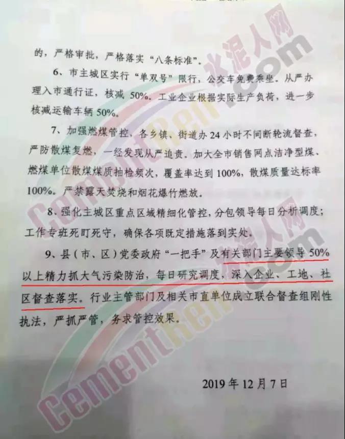 會議強調(diào),2019年大氣污染防治強化攻堅沖刺期間,將圍繞工業(yè)企業(yè)監(jiān)管執(zhí)法、嚴控重型車、嚴查非道路移動機械等方面,全力做好重污染天氣管控。一是嚴查豁免項目,對已評為標桿攪拌站的,或享受豁免政策的,發(fā)現(xiàn)存在違法違規(guī)行為,一律從嚴處罰,并根據(jù)情形責(zé)令降級或退出豁免名單。二是嚴查工業(yè)企業(yè),對全市7774家企業(yè)進行逐家篩查,除今年納入紅色預(yù)警豁免的1438家重點企業(yè)外,對沒有完成深度治理或存在超標排放行為的,嚴格實施停產(chǎn)整治。三是嚴控重型車輛。大宗貨物運輸企業(yè)門禁系統(tǒng)按時全部安裝到位,聯(lián)網(wǎng)進行監(jiān)管;應(yīng)急管控期間,禁止使用國Ⅳ及以下重型運輸車輛;在重度污染時,除民生保障外,停止大宗貨物運輸。四是嚴查非道路移動機械。對全市在用非道路移動機械進行拉網(wǎng)式排查,對使用未掛牌、不達標非道路移動機械的,一經(jīng)發(fā)現(xiàn),嚴查重處。從目前各地發(fā)布的重污染天氣預(yù)警響應(yīng)以及相關(guān)政府部門的年底沖刺計劃來看,國內(nèi)的水泥、商混行業(yè)又將迎來新一輪停產(chǎn)潮,而且一潮高于一潮,在這種情況下,水泥、混凝土、砂石供應(yīng)趨緊,價格將會繼續(xù)狂舞。