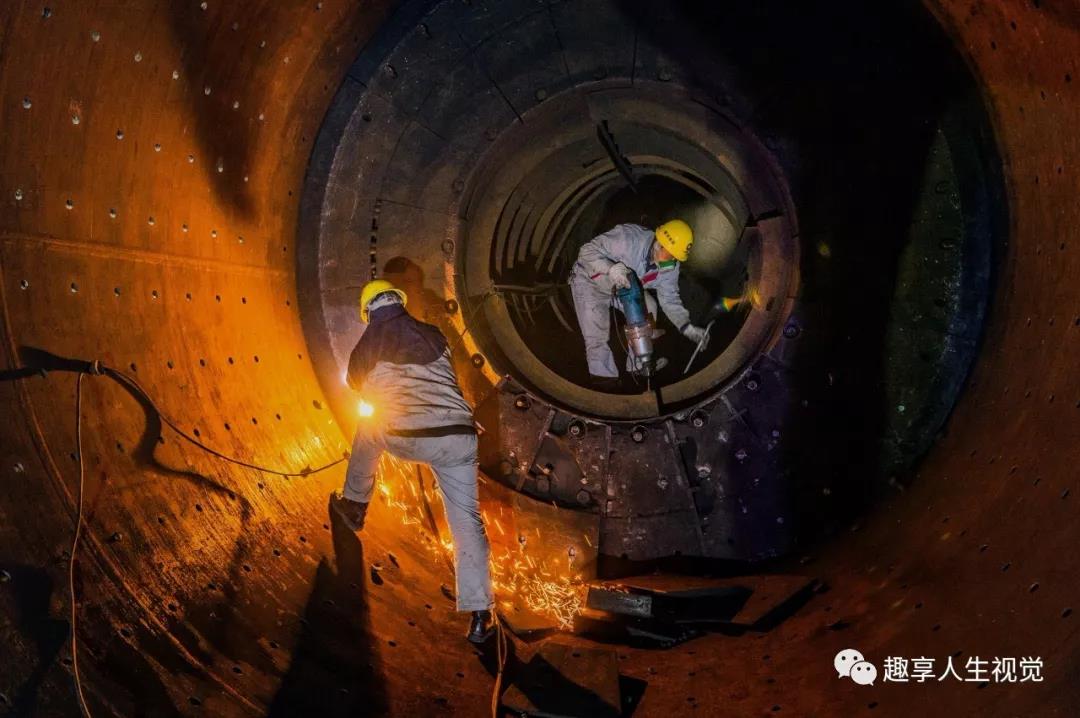 2019年2月15日常德南方水泥,電焊工黃建成在規(guī)格為3.8mx8.75m的風(fēng)掃煤磨球磨機(jī)內(nèi)切割。