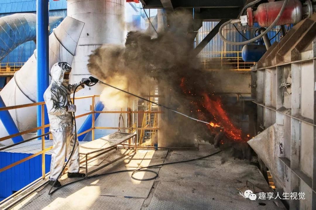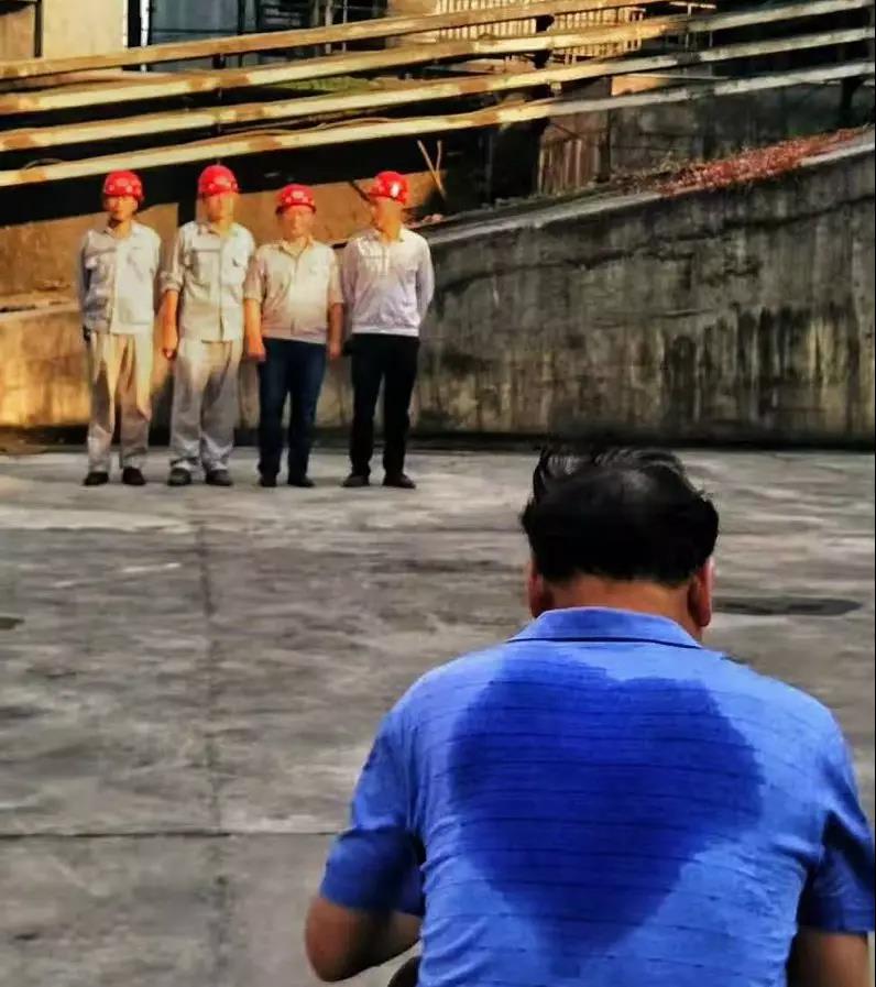 2019年8月23日常德南方水泥,預(yù)熱巡檢工姜業(yè)華在2000度高溫回轉(zhuǎn)窯的窯頭檢測(cè)窯溫。