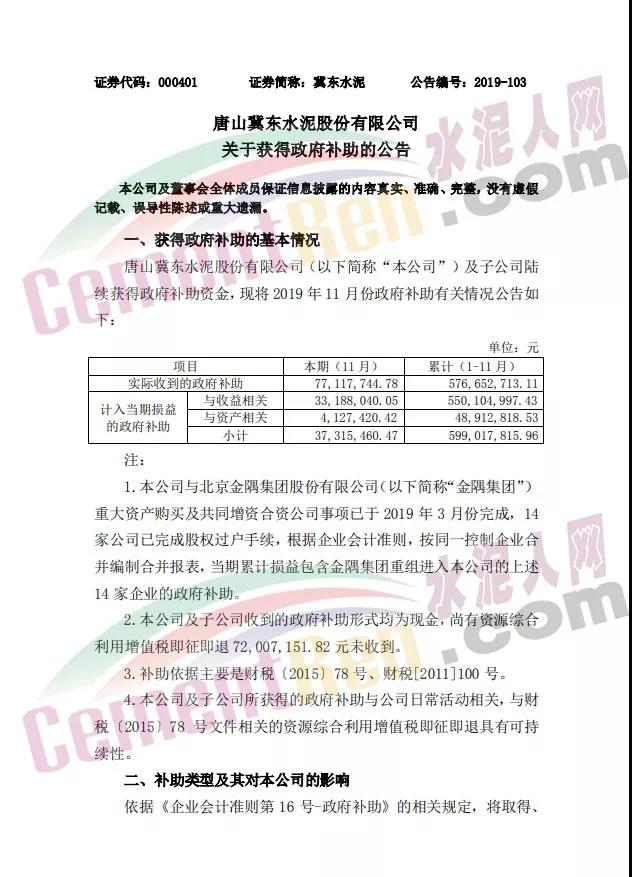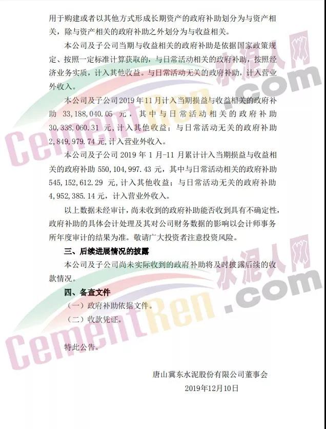 冀東水泥及子公司收到的政府補(bǔ)助形式均為現(xiàn)金,尚有資源綜合利用增值稅即征即退 7200.72萬(wàn)元未收到。公司及子公司2019 年11月計(jì)入當(dāng)期損益與收益相關(guān)的政府補(bǔ)助 3318.80萬(wàn)元 ,其中與日?;顒?dòng)相關(guān)的政府補(bǔ)助3033.81萬(wàn)元,計(jì)入其他收益;與日常活動(dòng)無(wú)關(guān)的政府補(bǔ)助 285萬(wàn)元,計(jì)入營(yíng)業(yè)外收入。