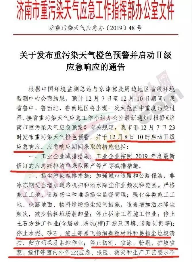 以山東濟(jì)南市重污染天氣應(yīng)急工作指揮部辦公室發(fā)布《關(guān)于發(fā)布重污染天氣橙色預(yù)警并啟動Ⅱ級應(yīng)急響應(yīng)的通告》為例,12 月 7 日 23 時發(fā)布重污染天氣橙色預(yù)警,并于 12 月 8 日 10 時啟動Ⅱ級應(yīng)急響應(yīng)。