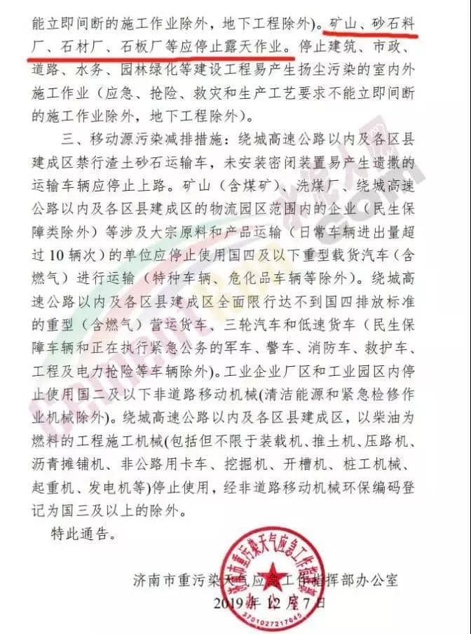 根據(jù)工業(yè)企業(yè)按照 2019 年度最新修訂的應(yīng)急減排清單采取限產(chǎn)停產(chǎn)等減排措施。停止水泥、砂石、渣土等易飛揚細(xì)顆粒材料和易揚塵垃圾清掃、歸方碼垛及裝卸作業(yè);停止切割、噴涂、粉刷、護(hù)坡噴漿、攪拌等室內(nèi)外作業(yè)(應(yīng)急、搶險、災(zāi)和生產(chǎn)工藝要求不能立即間斷的施工作業(yè)除外,地下工程除外)。礦山、砂石料廠、石材廠、石板廠等應(yīng)停止露天作業(yè)。停止建筑、市政、道路、水務(wù)、園林綠化等建設(shè)工程易產(chǎn)生揚塵污染的室內(nèi)外施工作業(yè)(應(yīng)急、搶險、救災(zāi)和生產(chǎn)工藝要求不能立即間斷的施工作業(yè)除外,地下工程除外)。