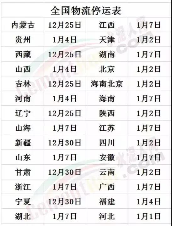 時至年底,隨著天氣寒冷和最近霧霾天氣嚴(yán)重,物流部發(fā)出聲明,全國物流停運時間已經(jīng)確定:內(nèi)蒙古、西藏、吉林、遼寧等地12月25日停運;新疆、甘肅、寧夏等地12月30日停運;河北1月1日停運;天津、北京、陜西、四川、云南等地1月2日停運;福建、貴州、山西、河南等地1月4日停運;上海、山東、浙江、湖北、江西、湖南、海南、江蘇、安徽、廣西等地1月7日停運。