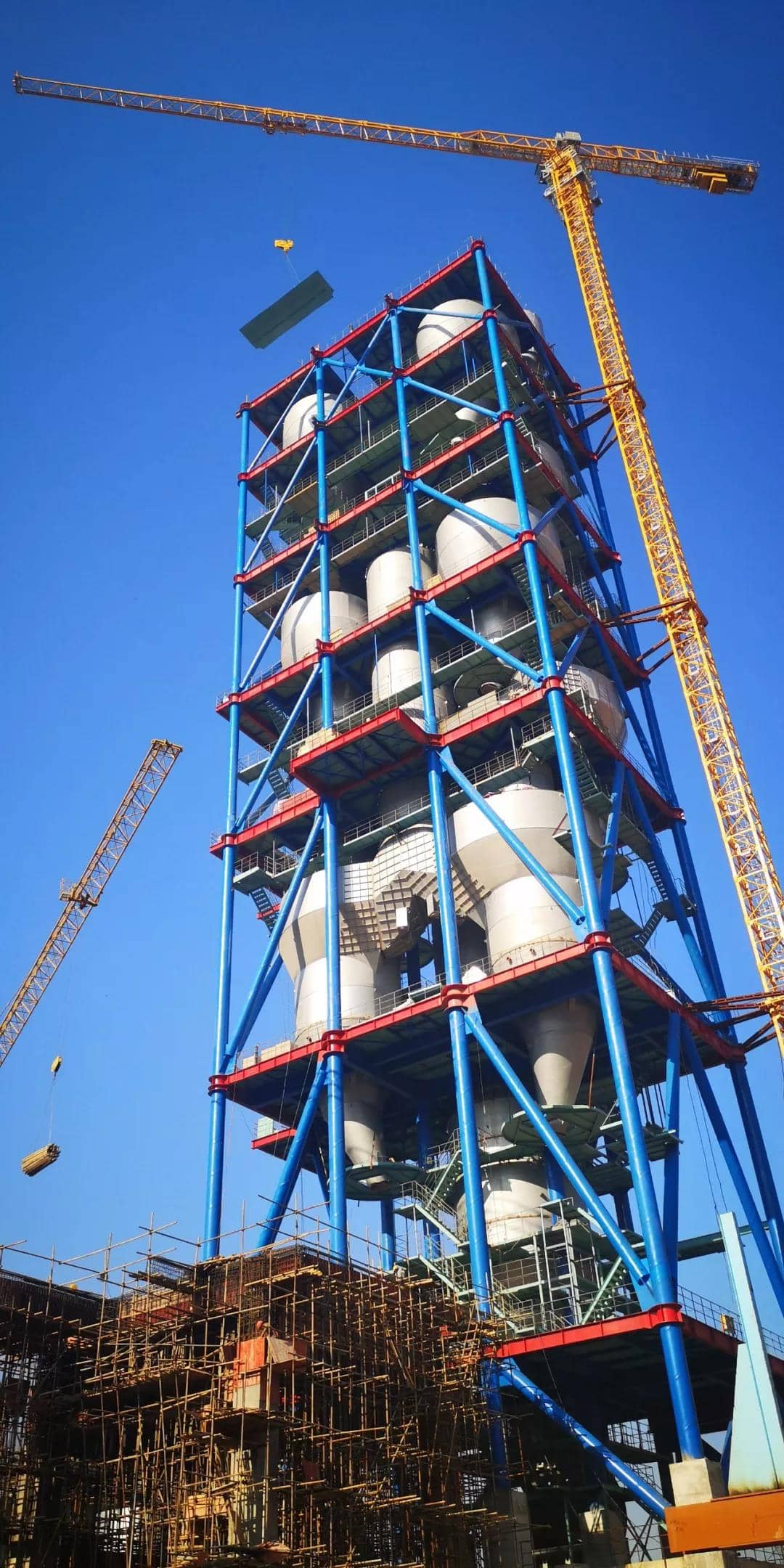 回轉(zhuǎn)窯窯尾是項目建設(shè)中的最高建筑,主要包括預(yù)熱器、分解爐等大型設(shè)備,在整個工藝流程中擔(dān)負(fù)生料喂入旋風(fēng)筒、循環(huán)預(yù)熱分解后入窯的重要作用。8月18日貴州尖峰項目的設(shè)備安裝“第一吊”,也是從窯尾開始的。