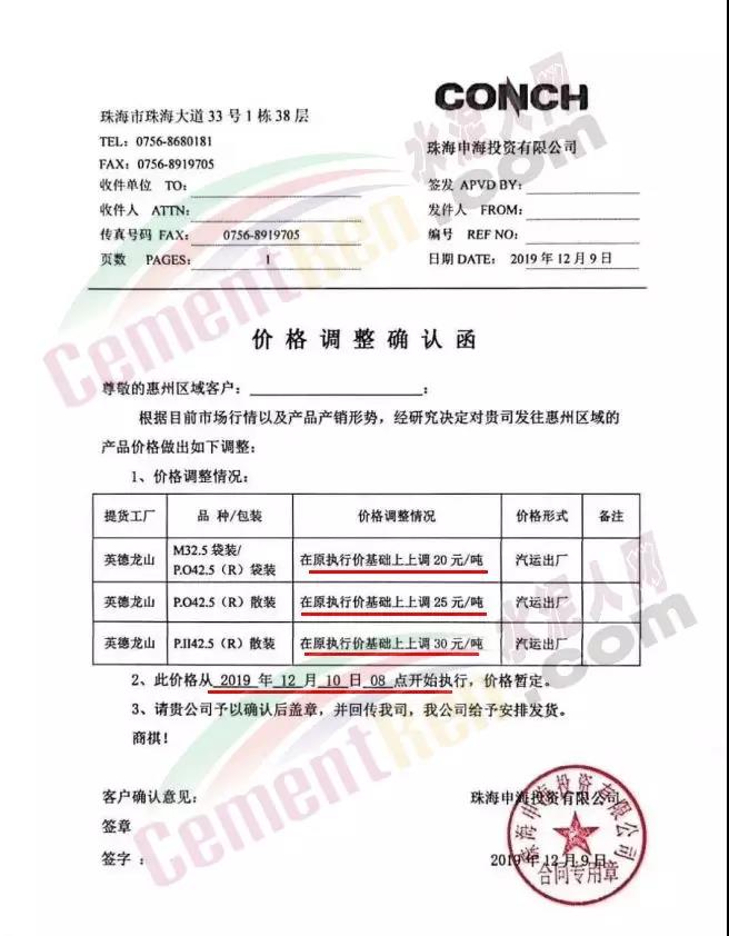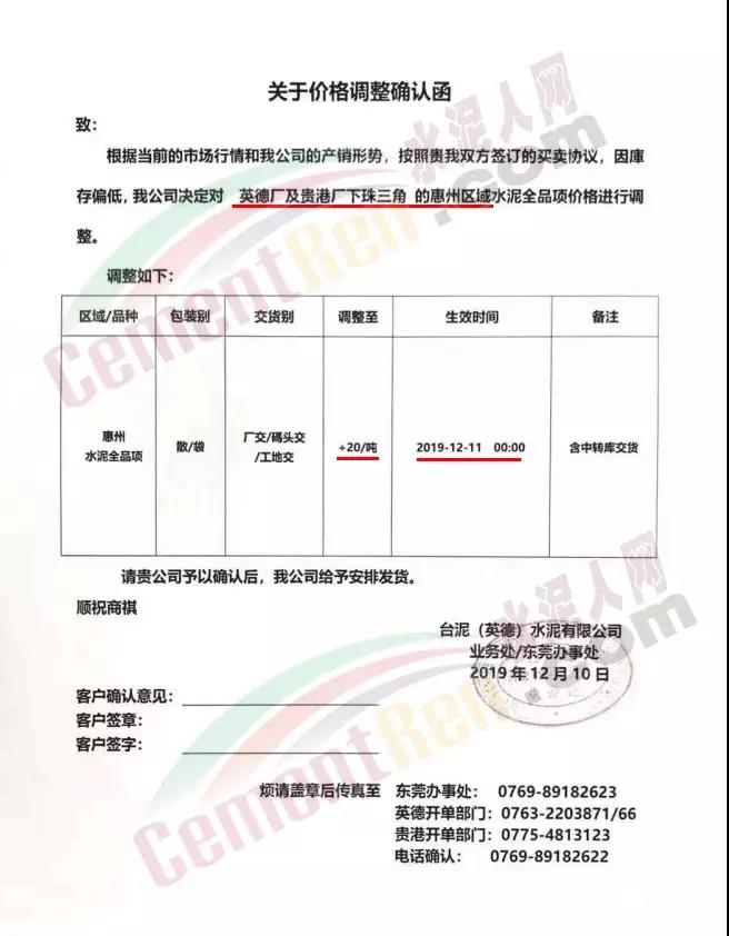 因廠內水泥庫存持續(xù)低位,我司決定于2019年12月10日00:00起,對興業(yè)的全品項散裝水泥出廠價格統(tǒng)一上調20元/噸。對貴港、桂平、平南、橫縣全品項袋泥、散泥上漲20元/噸。溫馨提示: 價格調整后,如繼續(xù)安排車輛到我司提貨,視為確認此次價格調整!順祝商祺!