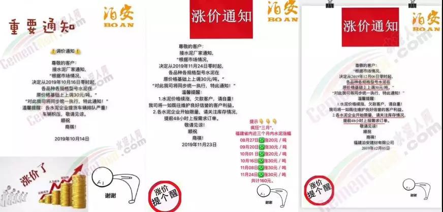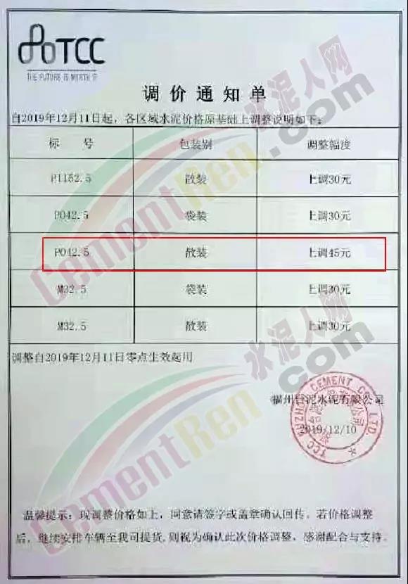 根據近期市場行情變化,我公司決定于2019年12月12日起,所有品種散裝、袋裝水泥出庫價在原有基礎上調30元/噸。順祝商祺!【福建鼎日實業(yè)有限公司】
