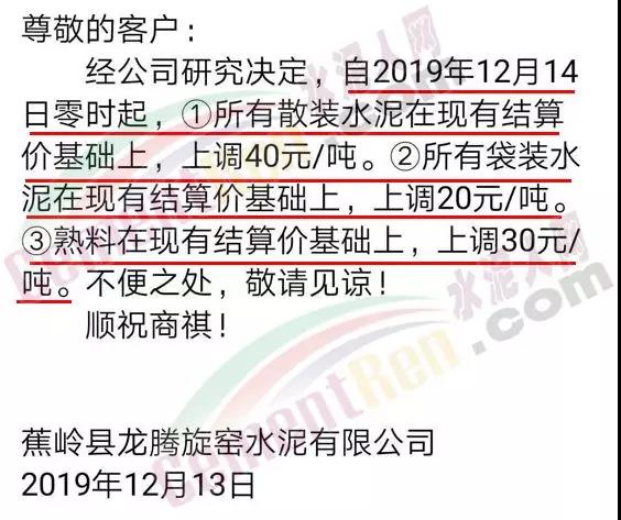 感謝您一直以來對我司的大力支持、根據(jù)目前市場行情,經(jīng)公司研究決定,自2019年12月14日6時起,我司發(fā)往各區(qū)域的全部品牌各規(guī)格袋、散裝水泥的出廠價格上調(diào)30元/噸。