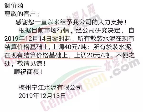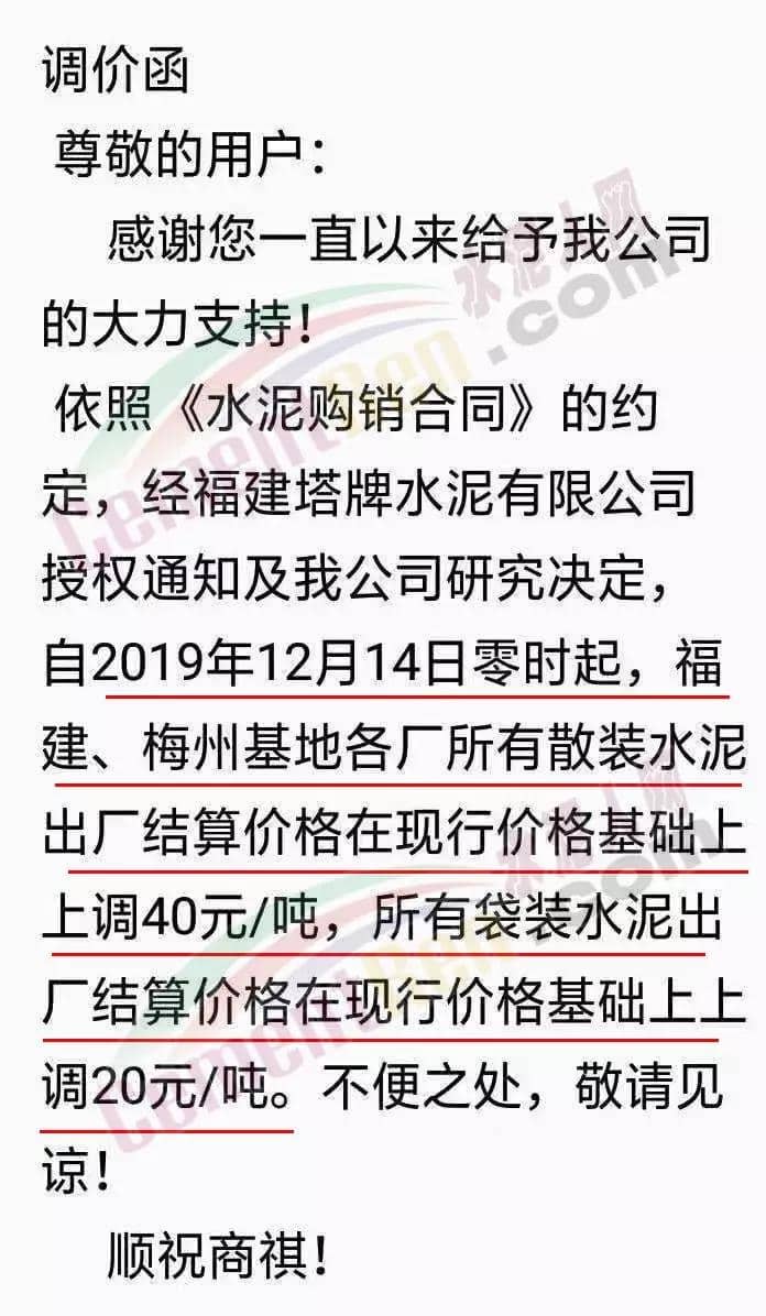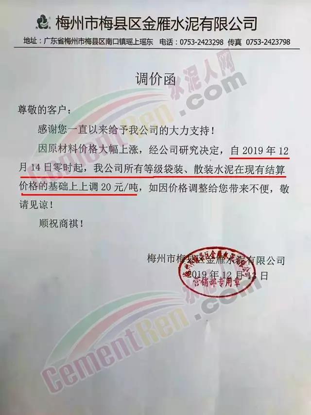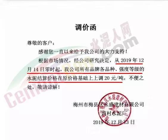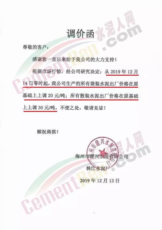 根據(jù)市場情況,經(jīng)研究,決定從2019年12月14日零時起,本公司發(fā)往福建省內(nèi)各品種各規(guī)格型號水泥在原價格基礎(chǔ)上上調(diào)30元/噸。