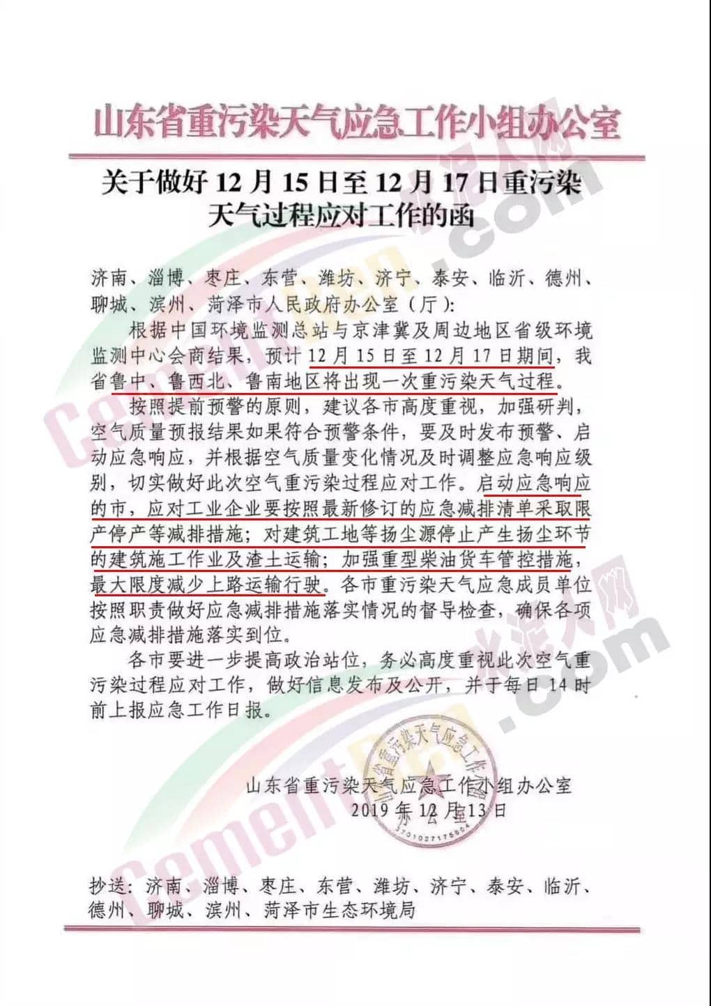 日前,山東省重污染天氣應急工作小組辦公室發(fā)布《關于做好12月15日至12月17日重污染天氣過程應對工作的函》稱提到12月15日至12月17日期間山東省魯中、魯西北、魯南地區(qū)將出現(xiàn)一次重污染天氣過程 。按照提前預警的原則,建議濟南、淄博、棗莊、東營、濰坊、濟寧、泰安、臨沂、德州、聊城、濱州、荷澤市12個城市,高度重視并加強研判,空氣質量預報結果如果符合預警條件,要及時發(fā)布預警、啟動應急響應,并根據(jù)空氣質量變化情況及時調整應急響應級別,切實做好此次空氣重污染過程應對工作。此次預警,山東省300多家水泥熟料和粉磨站企業(yè)將要面臨新一輪的停限產(chǎn)。