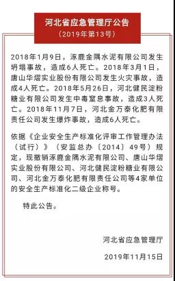 前不久,河北省應(yīng)急管理廳發(fā)布2019年第13號公告稱,2018年1月9日發(fā)生在河北省張家口市涿鹿金隅水泥有限公司發(fā)布坍塌事故,造成6人死亡。依據(jù)《企業(yè)安全生產(chǎn)標(biāo)準(zhǔn)化評審工作管理辦法(試行)》規(guī)定,撤銷涿鹿金隅水泥有限公司安全生產(chǎn)標(biāo)準(zhǔn)化二級企業(yè)稱號。