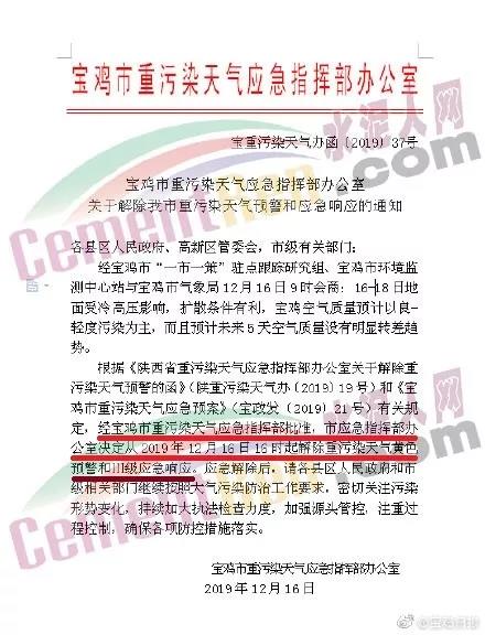 12月16日,寶雞市重污染天氣應(yīng)急指揮部辦公室發(fā)布了《關(guān)于解除重污染天氣預(yù)警和應(yīng)急響應(yīng)的通知》稱,寶雞市空氣質(zhì)量預(yù)計(jì)以良-輕度污染為主,而且預(yù)計(jì)未來5天工期質(zhì)量沒有明顯轉(zhuǎn)差趨勢,經(jīng)寶雞市重污染天氣應(yīng)急指揮部批準(zhǔn),市應(yīng)急指揮部辦公室決定從2019年12月16日16時起解除重污染天氣黃色預(yù)警。