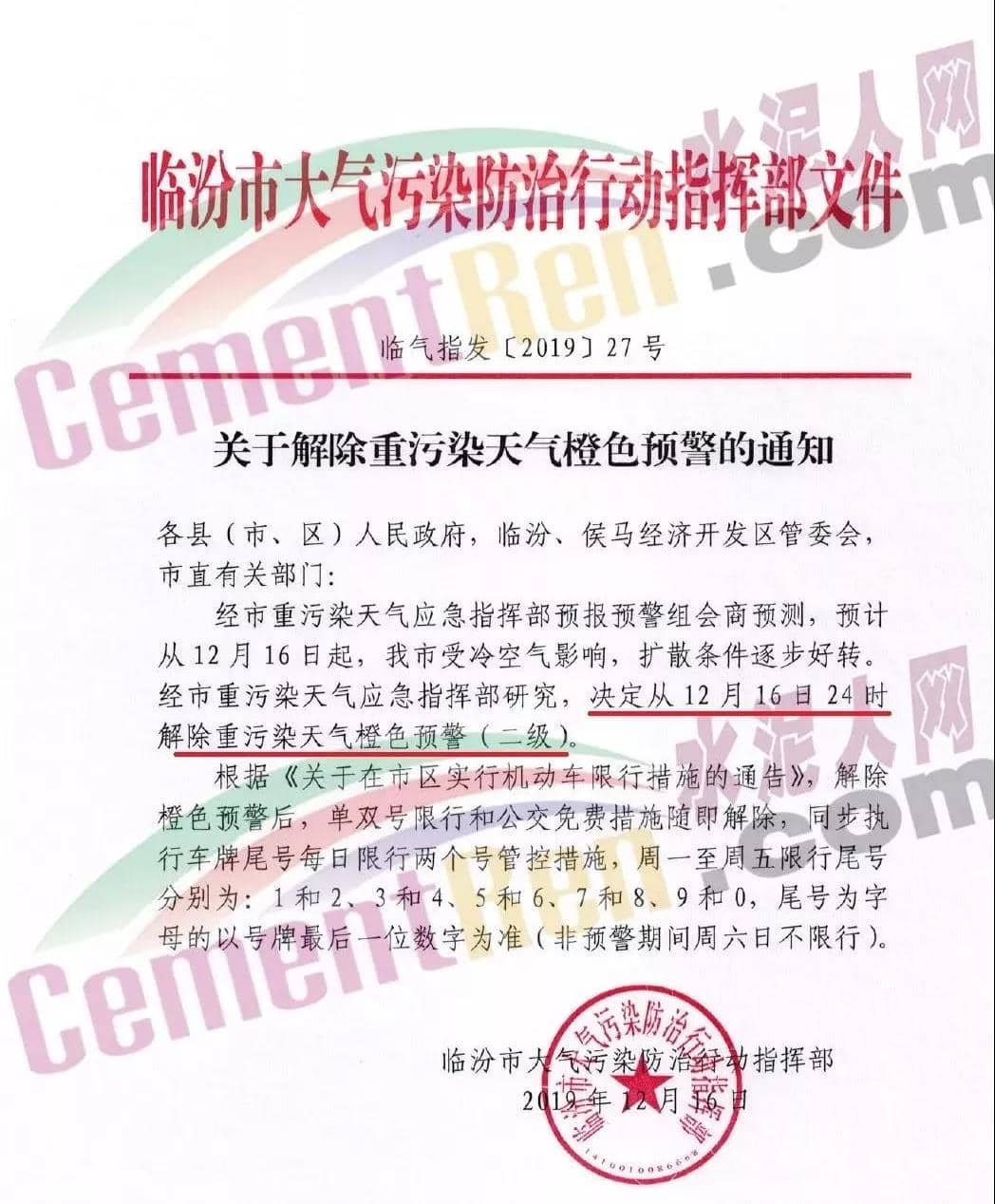 12月16日,臨汾市大氣污染防治行動指揮部發(fā)布了《關(guān)于解除重污染天氣橙色預(yù)警的通知》稱,經(jīng)臨汾經(jīng)市重污染天氣應(yīng)急指揮部預(yù)報(bào)預(yù)警組會商預(yù)測,預(yù)計(jì)從12月16日起,我市受冷空氣影響,擴(kuò)散條件逐步好轉(zhuǎn)。經(jīng)市重污染天氣應(yīng)急指揮部研究,決定從12月16日24時解除重污染天氣橙色預(yù)警(二級)。