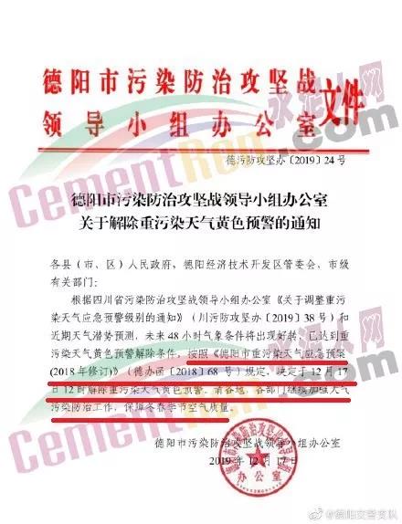 12月17日德陽市污染防治攻堅(jiān)戰(zhàn)領(lǐng)導(dǎo)小組辦公室發(fā)布了《關(guān)于解除重污染天氣黃色預(yù)警的通知》稱,根據(jù)四川省污染防治攻堅(jiān)戰(zhàn)領(lǐng)導(dǎo)小組辦公室《關(guān)于調(diào)整重污染天氣應(yīng)急預(yù)警級別的通知》(川污防攻堅(jiān)辦〔2019〕38 號)和近期天氣潛勢預(yù)測,未來 48 小時氣象條件將出現(xiàn)好轉(zhuǎn),已達(dá)到重污染天氣黃色預(yù)警解除條件,按照《德陽市重污染天氣應(yīng)急預(yù)案(2018 年修訂)》(德辦函〔2018〕68 號)規(guī)定,決定于 12 月 17日 12 時解除重污染天氣黃色預(yù)警。