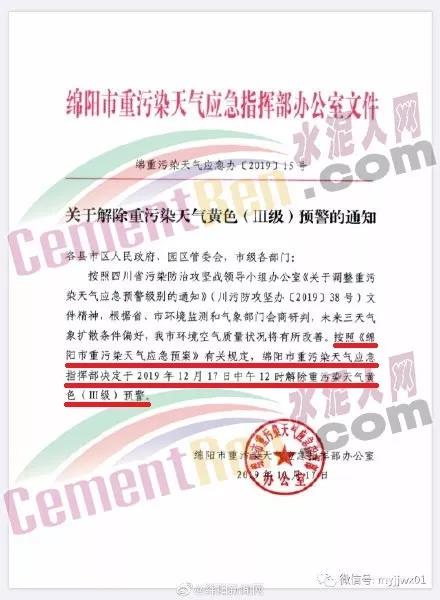 12月16日,綿陽市重污染天氣應(yīng)急指揮部發(fā)布了《關(guān)于12月16日中午12時起將重污染天氣橙色預(yù)警降級為黃色預(yù)警的通知》,12月17日,重污染天氣應(yīng)急指揮部發(fā)布《解除重污染天氣黃色預(yù)警》稱,按照《綿陽市重污染天氣應(yīng)急預(yù)案》有關(guān)規(guī)定,綿陽市重污染天氣應(yīng)急指揮部決定于2019年12月17日中午12時解除重污染天氣黃色(III級)預(yù)警。
