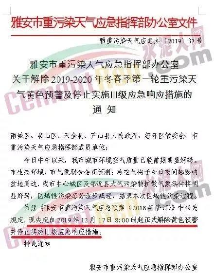 12月16日,雅安市重污染天氣應(yīng)急指揮部辦公室發(fā)布了《關(guān)于解除重污染天氣黃色預(yù)警通知》稱,依照《雅安市重污染天氣應(yīng)急預(yù)案(2018年修訂)》中相關(guān)規(guī)定,現(xiàn)決定自2019年12月17日8:00時起正式解除黃色預(yù)警并停止實(shí)施Ⅲ級應(yīng)急響應(yīng)措施。