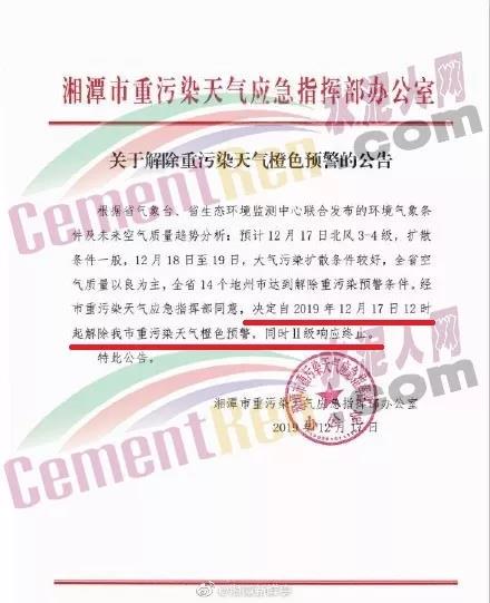 12月17日,湘潭市重污染天氣應(yīng)急指揮部辦公室發(fā)出《關(guān)于解除重污染天氣橙色預(yù)警的公告》,公告表明,決定自17日12時起 ,解除湘潭市重污染天氣橙色預(yù)警,同時II級響應(yīng)終止。