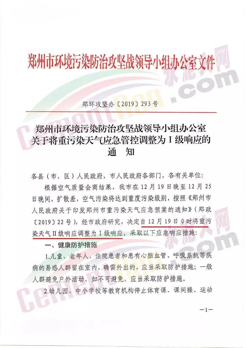 日前,鄭州市環(huán)境污染防治攻堅(jiān)戰(zhàn)領(lǐng)導(dǎo)小組辦公室發(fā)布《關(guān)于將重污染天氣應(yīng)急管控調(diào)整為I級(jí)響應(yīng)的通知》稱根據(jù)空氣質(zhì)量會(huì)商結(jié)果,經(jīng)鄭州市政府研究決定自12月19日0時(shí)將重污染天氣II級(jí)響應(yīng)調(diào)整為I級(jí)響應(yīng)。