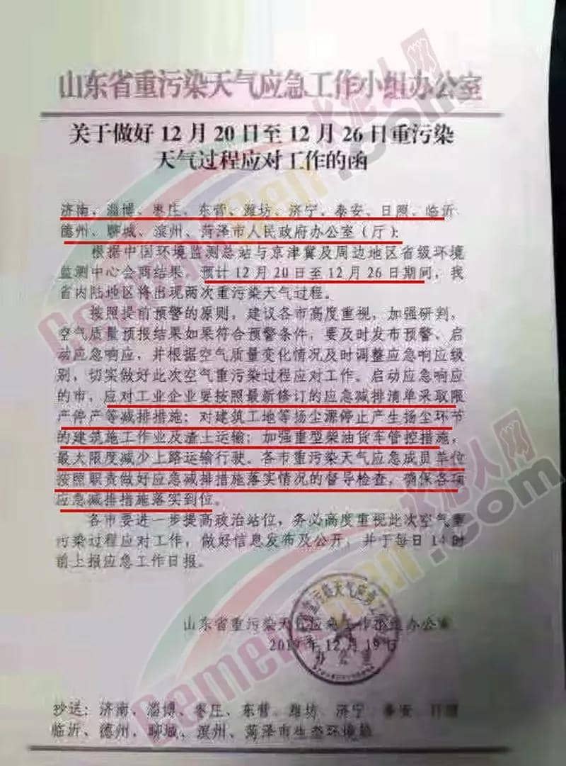 日前,山東省重污染天氣應急工作小組辦公室發(fā)《關于做好12月20日至12月26日重污染天氣過程應對工作的函》給濟南、淄博、棗莊、東營、濰坊、濟寧、泰安、日照、臨沂、德州、聊城、濱州、菏澤市等13市稱,根據中國環(huán)境監(jiān)測總站與京津冀及周邊地區(qū)省級環(huán)境監(jiān)測中心會商結果,預計12月20日至12月26日期間,山東省內陸地區(qū)將出現兩次重污染天氣過程。按照提前預警的原則,建議各市高度重視,加強研判,空氣質量預報結果如果符合預警條件,要及時發(fā)布預警,啟動應急響應,并根據空氣質量變化情況及時調整應急響應級別,切實做好此次空氣重污染過程應對工作。啟動應急響應的市,應對工業(yè)企業(yè)要按照最新修訂的應急減排清單采取限產停產等減排措施;對建筑工地等揚塵源停止產生揚塵環(huán)節(jié)的建筑施工作業(yè)及渣土運輸;加強重型柴油貨車管控措施,最大限度減少上路運輸行駛。各市重污染天氣應急成員單位按照職責做好應急減排措施落實情況的督導檢查,確保各項應急減排措施落實到位。各市要進一步提高政治站位,務必高度重視此次空氣重污染過程應對工作,做好信息發(fā)布及公開。文件原文如下: