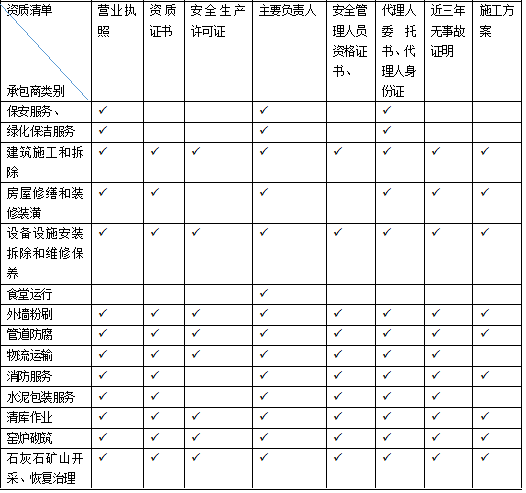 為便于各企業(yè)在審核時掌握情況,給出一份各類承包商資質清單供參考:
