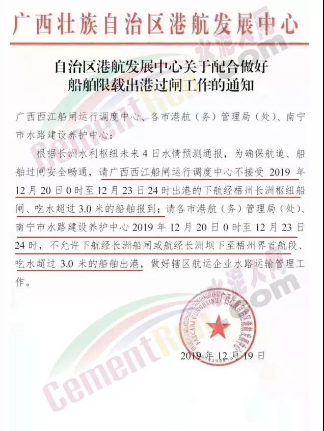 12月19日廣西壯族自治區(qū)港航發(fā)展中心發(fā)布《自治區(qū)港航發(fā)展中心關(guān)于配合做好船舶限載出港過(guò)閘工作的通知》稱:根據(jù)長(zhǎng)洲水利樞紐未來(lái)4日水情預(yù)測(cè)通報(bào),為確保航道、船舶過(guò)閘安全暢通,請(qǐng)廣西西江船閘運(yùn)行調(diào)度中心不接受2019年12月20日0時(shí)至12月23日24時(shí)出港的下航經(jīng)梧州長(zhǎng)洲樞紐船閘、吃水超過(guò)3.0米的船舶報(bào)到;請(qǐng)各市港航(務(wù))管理局(處)、南寧市水路建設(shè)養(yǎng)護(hù)中心2019年12月20日0時(shí)至12月23日24時(shí),不允許下航經(jīng)長(zhǎng)洲船閘或航經(jīng)長(zhǎng)洲壩下至梧州界首航段、吃水超過(guò)3.0米的船舶出港,做好轄區(qū)航運(yùn)企業(yè)水路運(yùn)輸管理工作。