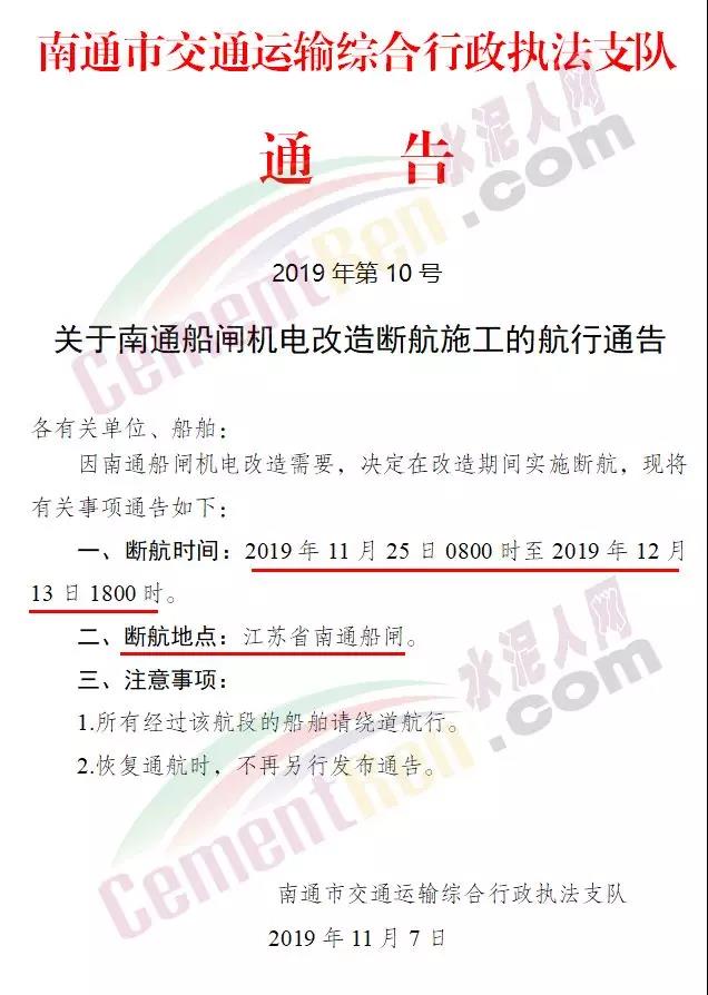 上個(gè)月南通市交通運(yùn)輸綜合行政執(zhí)法支隊(duì)發(fā)布《關(guān)于南通船閘機(jī)電改造斷航施工的航行通告》(2019年第10號(hào))稱因南通船閘機(jī)電改造需要,決定在改造期間實(shí)施斷航。斷航時(shí)間11月25日8時(shí)至12月13日18時(shí)。斷航地址為江蘇省南通船閘。要求所有經(jīng)過(guò)該航段的船舶繞道航行。